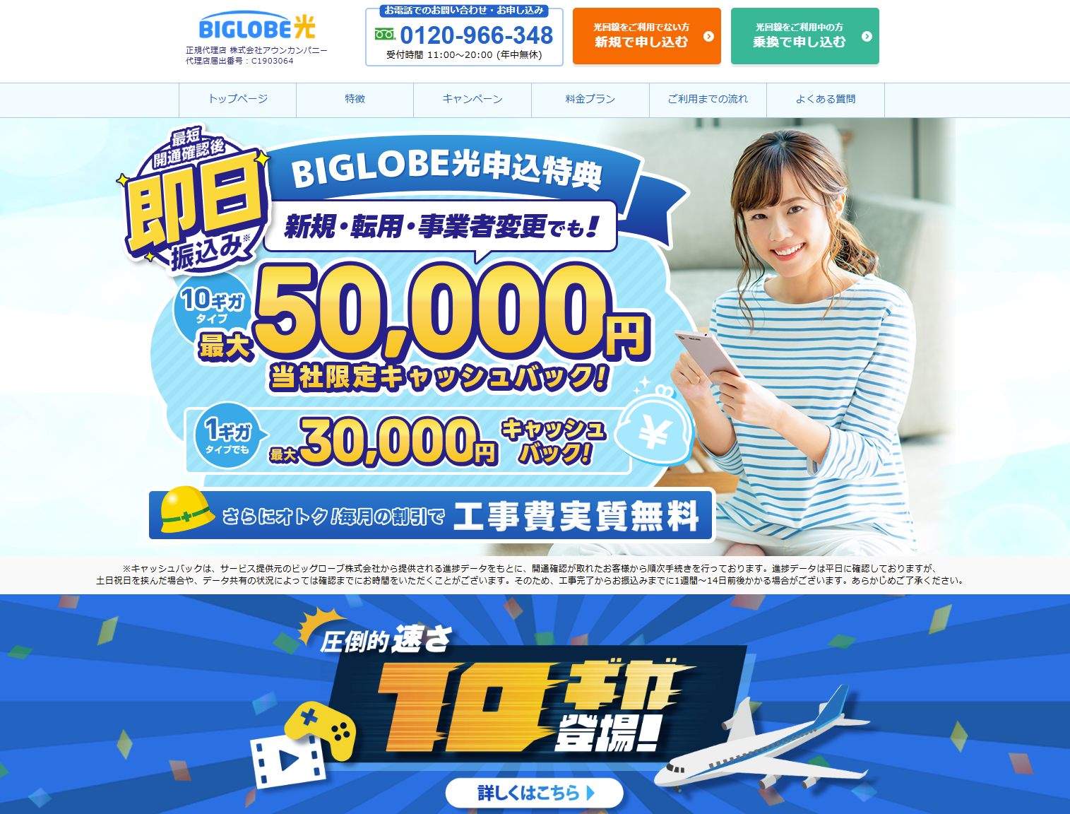 株式会社アウンカンパニーが運営するビッグローブ光キャンペーンサイトです。 ◆セールスポイント◆ ・ビッグローブ光とはNTT東日本・NTT西日本の「フレッツ光」サービスを  ビッグローブ株式会社が、速度・品質を変えずに、低価格で提供が可能となった、  光インターネット回線「ビッグローブ光」を中心に展開するサービスのことです。 ・運営会社はインターネット大手のBIGLOBEですので安心です。 ・すでにフレッツ光をご利用されているお客様の場合、  立会いの工事がいらないので非常に簡単にお切替え(転用)も可能となっております。 ◆ターゲットユーザー◆ 【女性/男性】全世代 ◆広告主からのメッセージ◆ ☆業界大手企業のビッグローブ株式会社が提供する光回線ですので、 認知度・知名度ともに抜群です!  ■キャンペーン内容  【当社限定】最大45,000円キャッシュバック+工事費実質無料のおトクなキャンペーンです!  【総額最大81,600円おトク!】  ◎ ビッグローブ光お申込み【新規でも転用で事業者でも】    ★10ギガ 45,000円キャッシュバック!★    ★1ギガ  35,000円キャッシュバック!★  ◎ 工事費実質無料!    (最大28,600円割引)  ◎ビッグローブ光電話お申込み    +4,000円キャッシュバック  ◎ビッグローブ光テレビお申込み    +4,000円キャッシュバック  ■キャッシュバック時期    最短開通確認後”即日”お振込み!  ※申請方法も電話で伝えるか、SMSで送信するだけ!  ※開通の基準について:サービス提供元であるビッグローブ株式会社へ開通状況を確認し、   開通の確認が取れたお客様へ順次キャッシュバックの振込手続きを進めてまいります。   開通の確認が取れない場合は、翌営業日以降に再度確認を行います。 ☆一度問い合わせがあったお客様には定期的にご連絡をお取し、  電話でのご連絡が取れないお客様にはメールで連絡を差し上げる等、成約に繋げる工夫をしております。