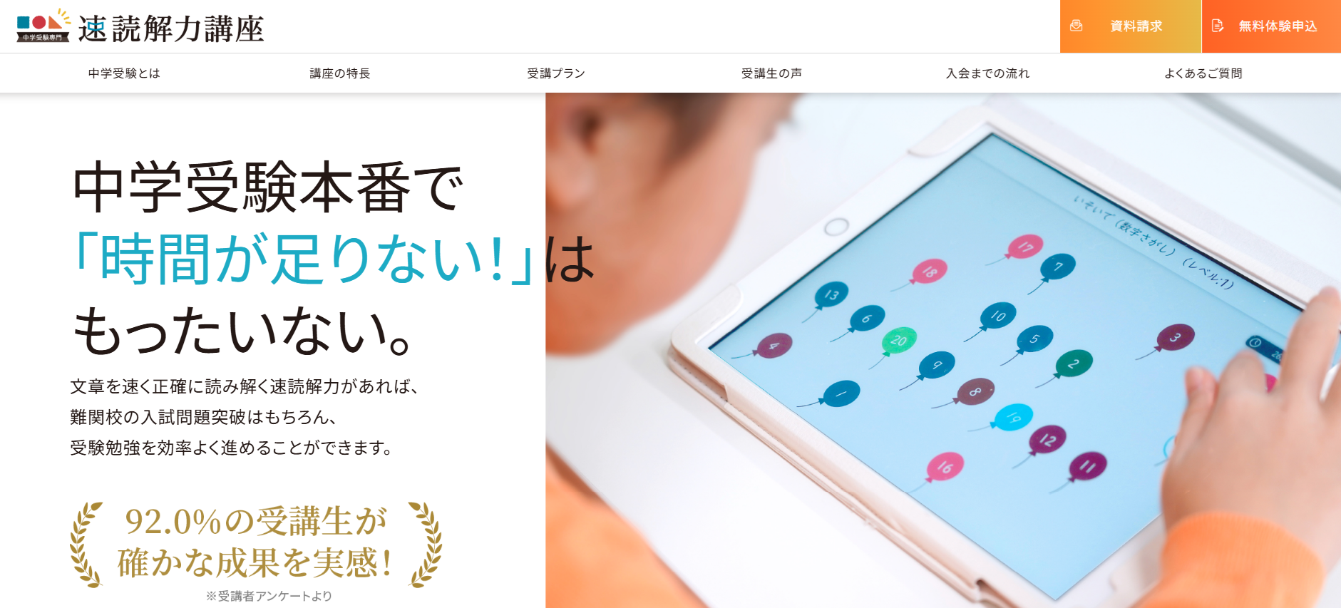 【PR】オンライン速読解力講座 速く正確に読み解く力を鍛える『速読解力講座』の申込サイトのご紹介です!【トレーニング内容】 一人ひとりのスピードに合った 速読力トレーニング 文章理解力や全体把握力を養成する 読解力トレーニング すべての学習の基礎能力を高める 脳力トレーニング 入試に役立つ語彙・時事問題 教科トレーニング☆おすすめポイント☆・25年の実績とノウハウで効果的な指導を実現 ・オンラインだから都合にあわせて受講可能 ・インストラクターによる徹底したフォロー体制 ・最新の中学受験情報など「アシスト動画」を毎月配信 ・オンライン学習相談も可能☆こんな方におすすめ☆・教育、生涯スキル、子育て、受験、子どもの習い事、勉強法に関連するテーマで情報を発信されている方 ・中学受験や子どもの学習基礎力、文章読解の苦手克服に関心のある読者層をお持ちの方 ・子どもの可能性を広げるサービスを読者にご紹介したい方主に小学生のお子さまを持つ保護者の方(30〜50代)を中心に、教育に関心の高いご家庭。 ・中学受験を考えている ・文章読解の苦手克服をしたい ・学習の土台となる速く正確に読み解く力を身につけたい 詳細はコチラをクリック 入会までの流れ STEP1 お問い合わせ資料も合わせて、送付するそうです。不明点や質問があったらお気軽にお問い合わせできます。 STEP2 無料体験体験の流れの案内を送ってくれます。案内に従って講座を体験受講を行っていくそうです。 STEP3 体験後カウンセリング体験レッスン受講後に、お子さまのご様子をお伺いしたり、受講にあたっての留意点などをお伝えするカウンセリング(入会面談)を実施いたします。 STEP4 入会のお手続き入会に関するお手続きの詳細は、体験後カウンセリングの際にお知らせするそうです。 受講プラン 商材名 オンライン速読解力講座運営者 (Y.H.)※当サイトはアフィリエイトプログラムを利用し宣伝目的で作成しております。