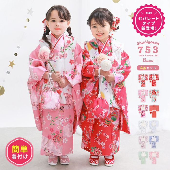 難しい着付け不要! 【 セパレート 4点セット 二部式被布セット 】 七五三 着物 3歳 753 二部式 女の子 三歳 ガールズ 雛祭り ひな祭り お正月(rg)