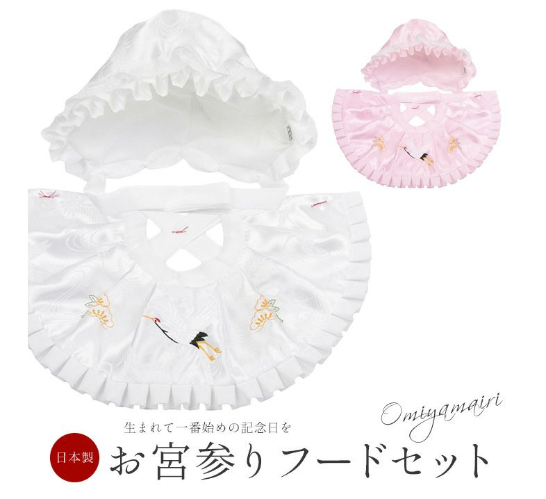 (日本製 フード2点セット)白/ピンク お宮参り フードセット 無地 フード(帽子)よだれかけ 初着 産着 男の子 女の子 和装小物