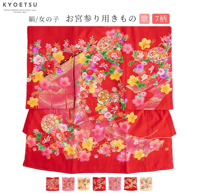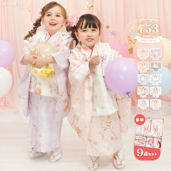 レンタルよりずっとお得!かわいいデザインを取り揃えた被布着物の9点フルセットです。